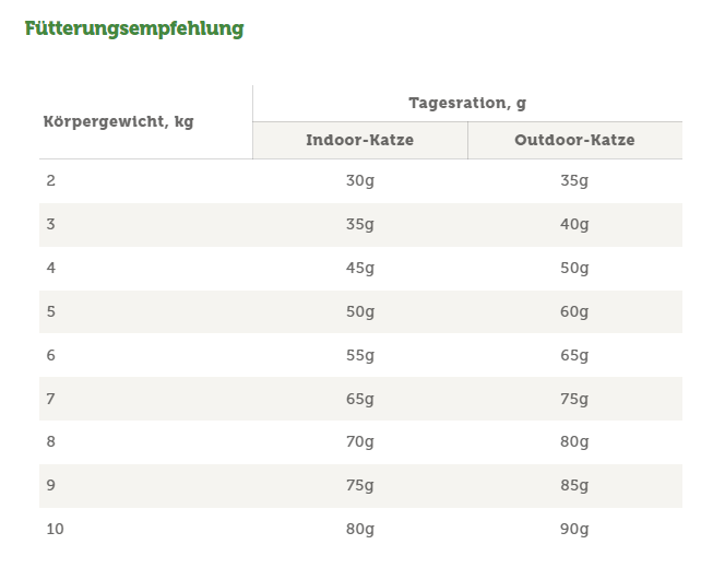 Ta popolna hrana se običajno daje suha. Zagotovite svoji mački stalen dostop do sveže vode. Priporočene količine so smernice na dan in jih je morda treba prilagoditi glede na zunanje dejavnike in individualne potrebe vaše mačke. Shranjevanje: Vse izdelke mera shranjujte na hladnem in suhem mestu, da zagotovite kakovost izdelka skozi celoten rok uporabnosti.
