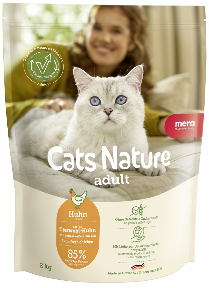 Suha hrana za odrasle mačke Cats Nature je popolna hrana za odrasle mačke od 12. meseca starosti – s 85 % živalskih beljakovin*, veliko svežega piščanca za najboljši okus in visokokakovostna hranila. Recept brez žitaric in dodanega sladkorja je lahko prebavljiv in primeren tudi za mačke z občutljivim želodcem. Optimalno oblikovani briketi zagotavljajo visoko okusnost.