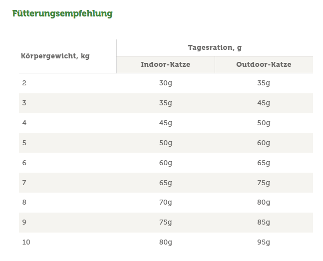 Ta popolna hrana se običajno daje suha. Zagotovite svoji mački stalen dostop do sveže vode. Priporočene količine so smernice na dan in jih je morda treba prilagoditi glede na zunanje dejavnike in individualne potrebe vaše mačke. Shranjevanje: Vse izdelke mera shranjujte na hladnem in suhem mestu, da zagotovite kakovost izdelka skozi celoten rok uporabnosti.