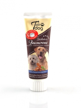 Krema Tubidog Bacon je na voljo v priročni tubi z navojnim pokrovčkom in je odličen način, da naše pse prepričamo, da jemljejo zdravila. Ima odličen aromatični vonj in je absolutni vrhunec za vsakega psa. Kremasto konsistenco lahko poližete neposredno iz tube.